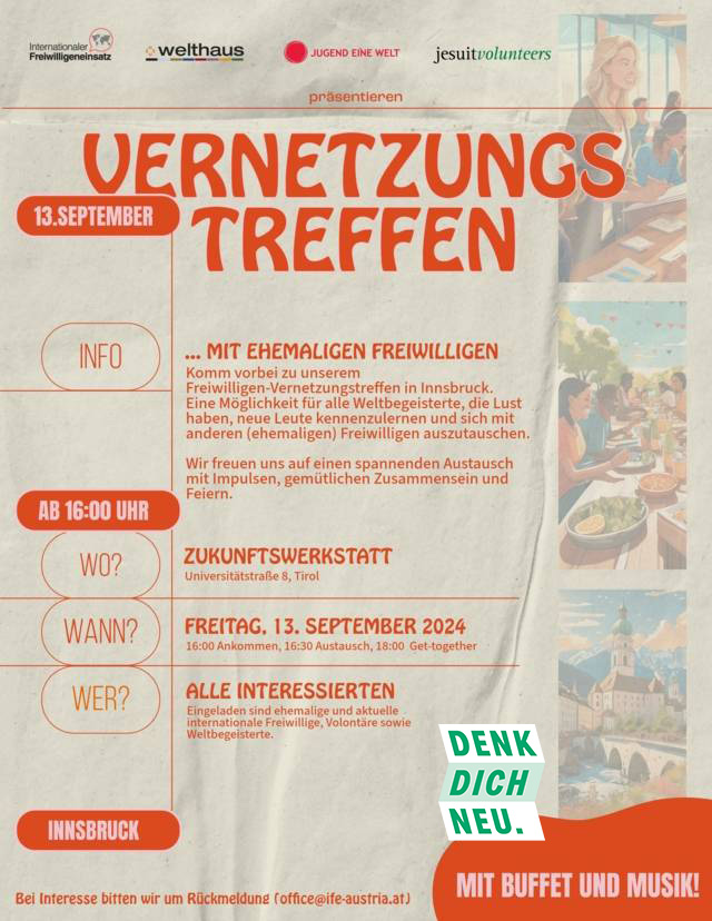 Komm vorbei zu unserem Freiwilligen-Vernetzungstreffen in Innsbruck. Eine Möglichkeit für alle Weltbegeisterte, die Lust haben, neue Leute kennenzulernen und sich mit anderen (ehemaligen) Freiwilligen auszutauschen.