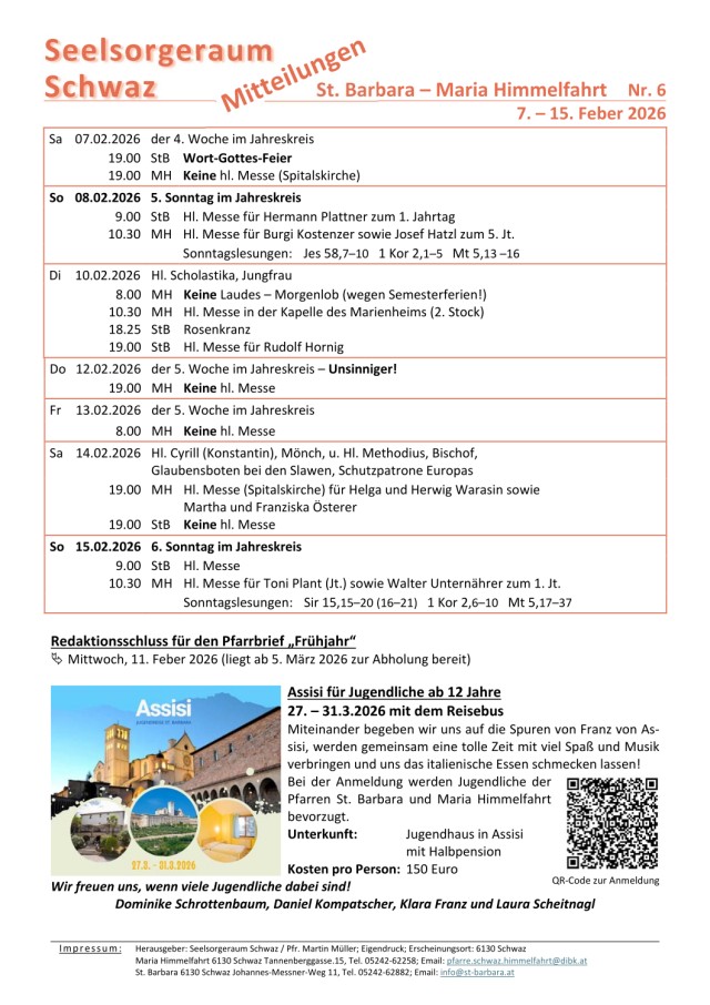 Wir geben ein wöchentliches Mitteilungsblatt mit den Gottesdiensten und mit Hinweisen auf das Pfarrleben heraus, das in der Pfarrkirche und in der Spitalskirche zur freien Entnahme aufliegt.