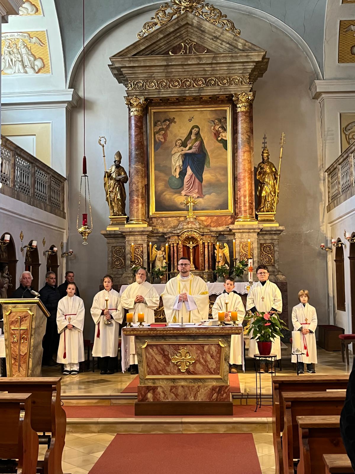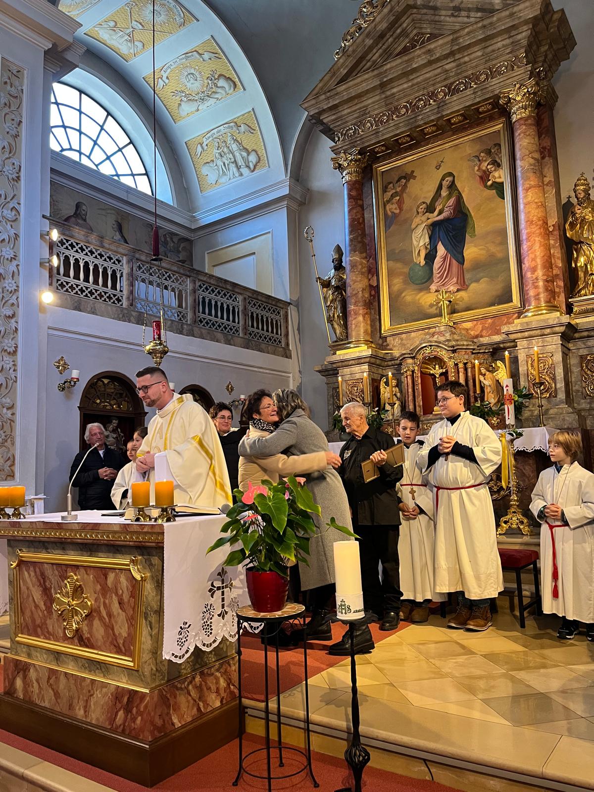 Ein Höhepunkt einer Cäciliafeier sind die Ehrungen von fleißigen Sängerinnen und Sängern. So wurden Julia Geisler für 35 Jahre und Helga Blunder für 25 Jahre Mitgliedschaft ausgezeichnet. Unglaubliche 75 Jahre beim Kirchenchor und 70 Jahre an der Orgel ist unser Franz Angerer. Dafür gab es eine herzliche Gratulation und viel Lob von unserem Pfarrer Piotr: „Lieber Franz, dafür dass du gemäß der Lehre Jesu deine Talente nicht in der Erde versteckt und vergraben hast, sondern im Gegenteil, sie ständig vermehrst, indem du zu seiner Ehre und unserer Freude spielst und singst, dafür dass du dabei keine Mühen scheust und dafür, dass wir uns auf dich verlassen können, möchten wir dir heute danken.“ Im Jahre 2026 soll es dann auch noch eine diözesane Auszeichnung, das Verdienst- und Ehrenzeichen für Franz geben.
