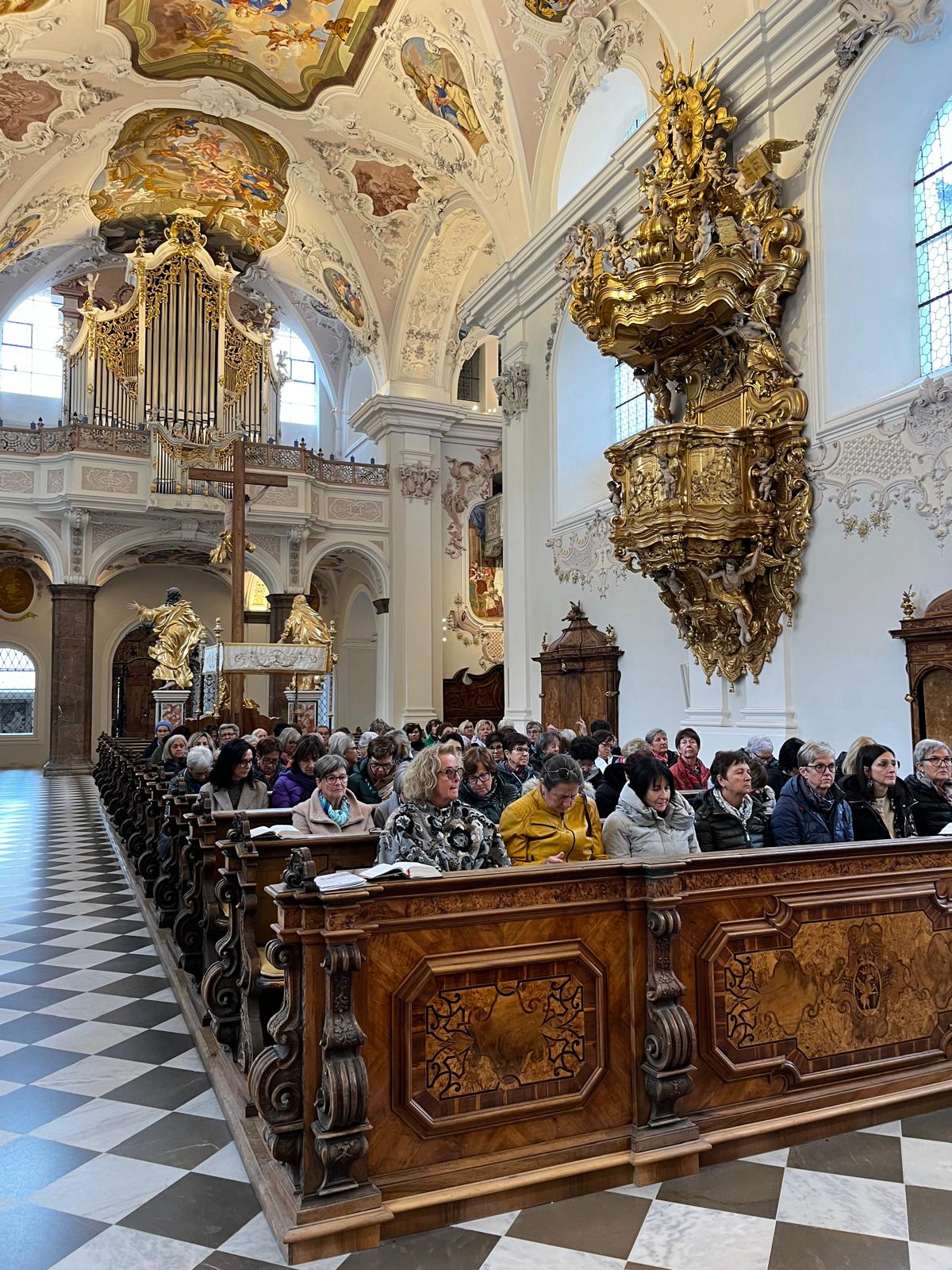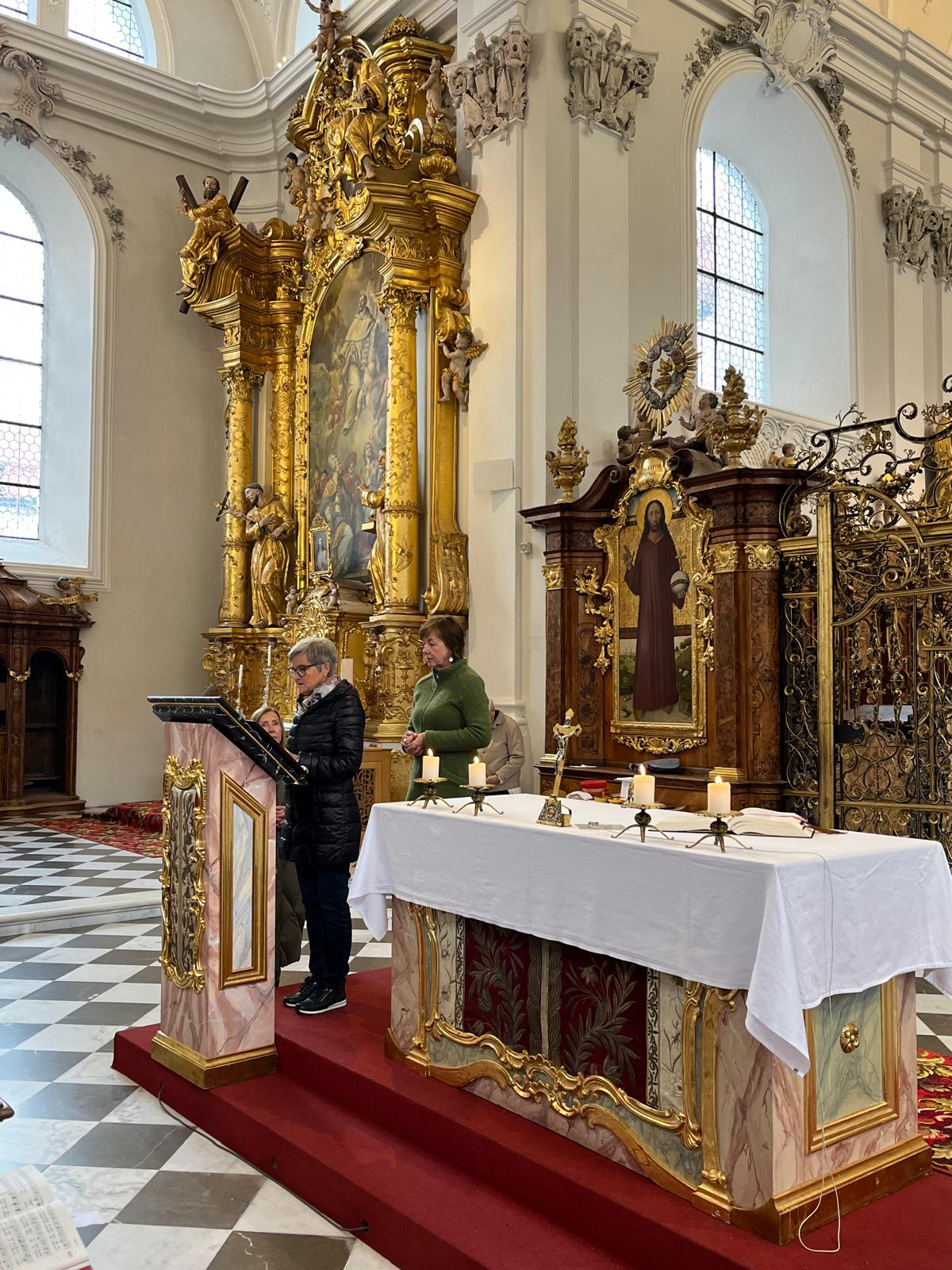Nach Ankunft im Stift Stams feierten wir um 10:00 Uhr eine gemeinsame hl. Messe in der prachtvollen Stiftskirche. Das Thema der Messe lautete „Mutter, die unter dem Kreuz steht“. Dabei wurde deutlich, dass nicht nur damals Maria unter dem Kreuz ihres Sohnes stand, sondern auch heute viele Mütter in ähnlicher Weise Leid tragen – etwa, wenn eine Tochter an Krebs erkrankt, ein Sohn der Sucht verfällt oder wiederum die Ehe eines Kinder zerbricht.