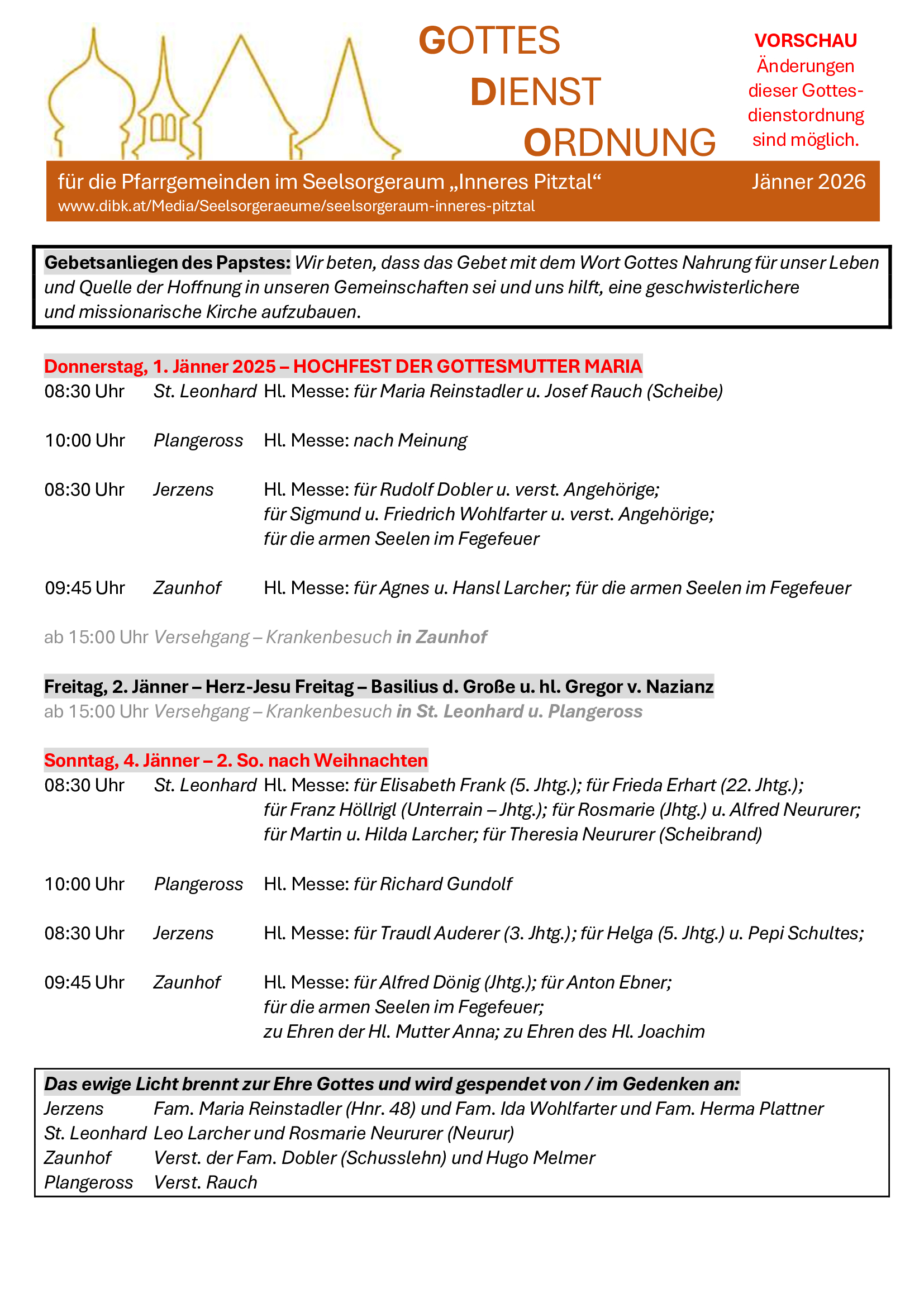 Die vier Kirchengemeinden des inneren Pitztals sind momentan auf dem Weg: auf einem Weg, der noch mehr das Zusammenleben, das Zusammenfeiern, das Zusammenglauben erlebbar machen möchte, ganz einfach deshalb, weil sich kirchliches Leben auch bei uns in den letzten Jahren sehr verändert hat und sich noch mehr verändern wird. Als Seelsorgeraum versuchen wir eine momentane Antwort auf diese strukturelle, den veränderten Lebensgewohnheiten angepasste, Veränderung zu geben.