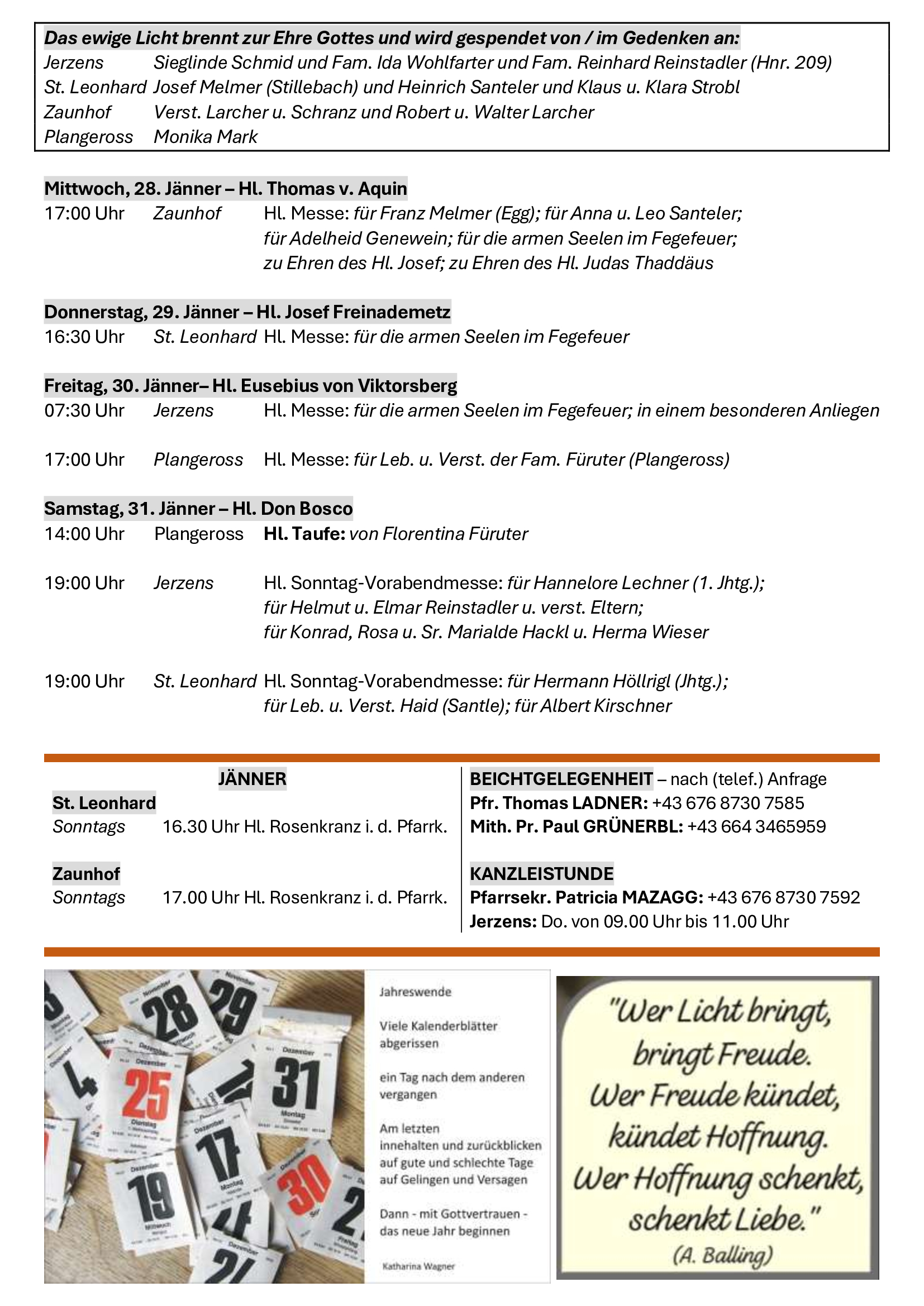 Neben all den äußeren Herausforderungen bleibt der Grundauftrag für jede unserer vier Kirchengemeinden der Auftrag Jesu, das Reich Gottes im konkreten Alltag zu suchen und umzusetzen. „Euch soll es zuerst um Gottes Reich und Gottes Gerechtigkeit gehen, dann wird er euch alles Übrige dazugeben.“ (Mt 6,33). Ich freue mich als zuständiger Pfarrer mit den Gläubigen vor Ort und mit den Gästen, die bei uns Erholung suchen, auf dem Weg zu sein, dem Reich Gottes nachzuspüren und ihm vielleicht auch eine konkrete Gestalt zu geben.