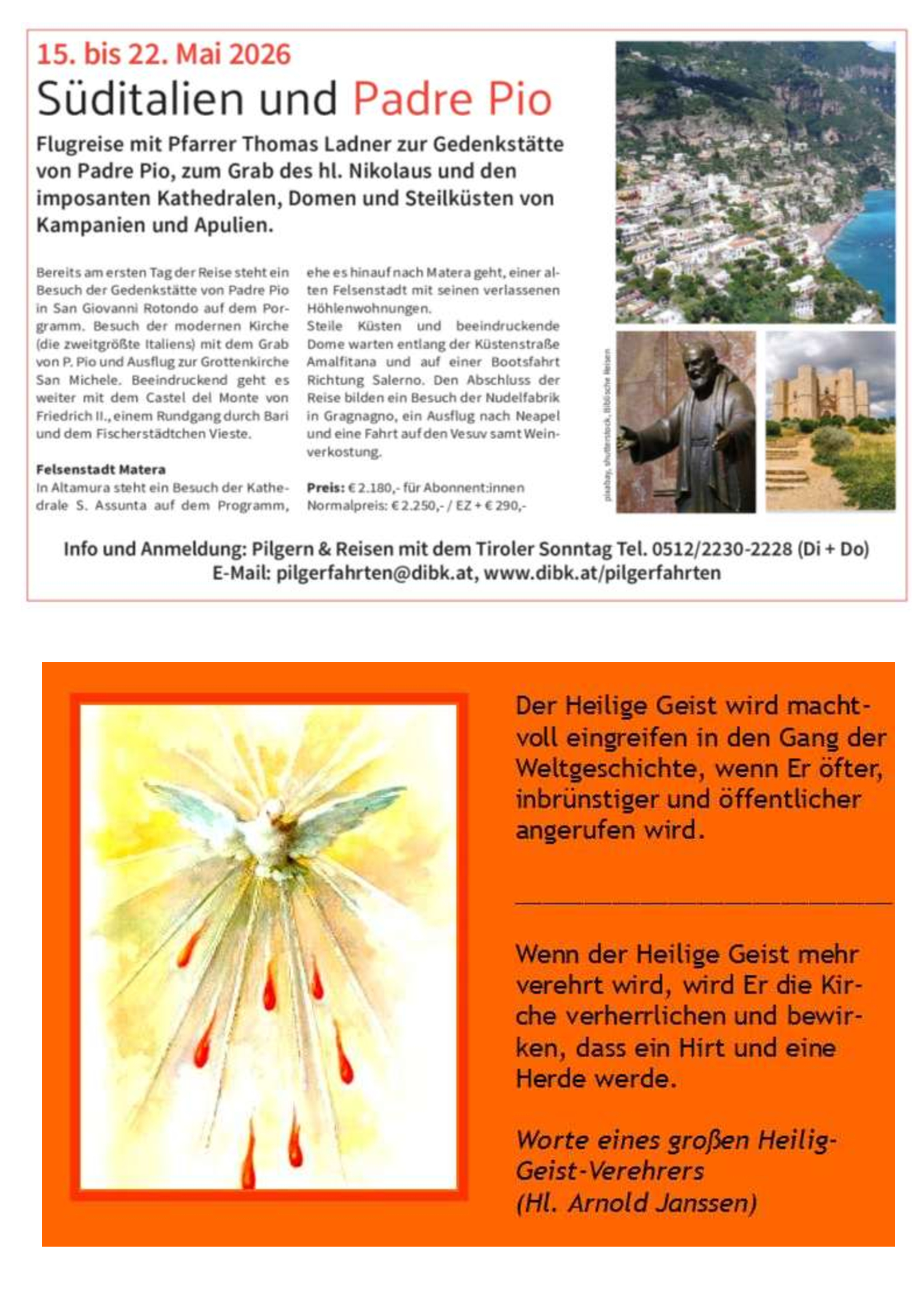Unsere herrliche Landschaft lädt nicht nur zum Urlaubmachen ein; unsere schönen Kirchen, Kapellen und Wegkreuze sind auch Zeugen für eine lange christlich-katholische Glaubenstradition im inneren Pitztal. Es sind Räume und Orte, die unser Leben mit Gott in Verbindung bringen wollen, die uns anstoßen, um über die Fragen des Lebens nachzudenken. Und: sie wollen der würdige Rahmen sein für unser Gebet (ob privat oder in Gemeinschaft) und die Liturgien und Sakramente der Kirche zu feiern.